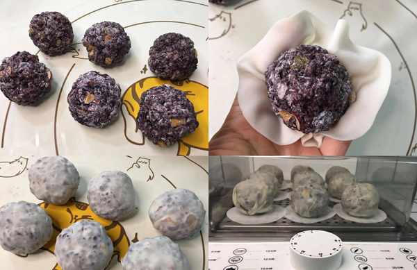 ⑥把餃子皮搟大後放上雜糧糯飯團,像包包子一樣包起來,收口朝下。
