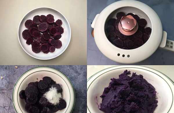 ①紫薯去皮切成薄片,裝入盤中,冷水上鍋蒸15分鐘,紫薯蒸熟後倒入碗中,加白糖和純牛奶,用勺子壓成泥備用。