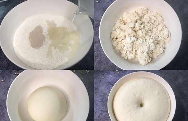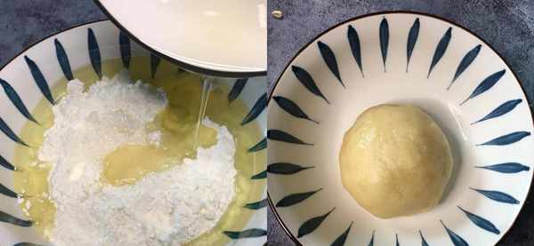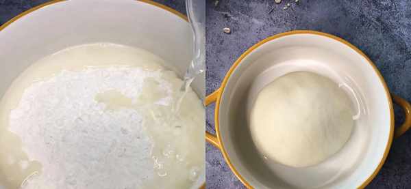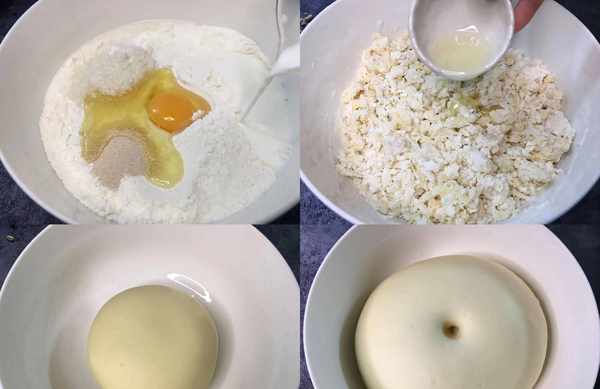 ②攪拌成面絮狀後再倒入20ml的玉米油,下手揉成光滑的面團,蓋好保鮮膜後醒發一個小時。