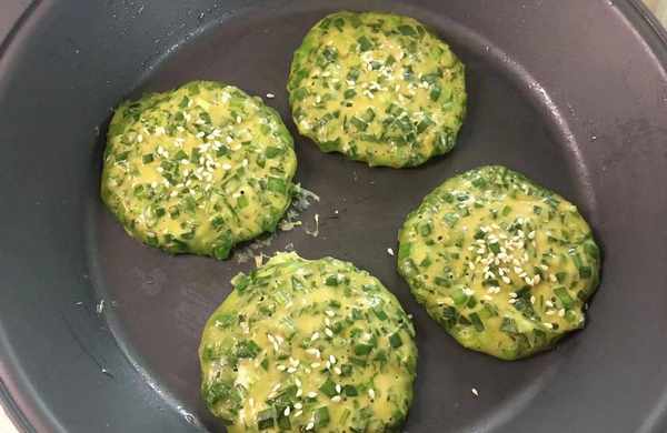 ②把面糊依次舀入鍋中,再借助矽膠鏟把面糊整理成圓餅狀,撒上一些白芝麻後開小火慢慢煎,煎至底部定型後翻個面繼續煎,記得要勤翻面防止糊鍋。