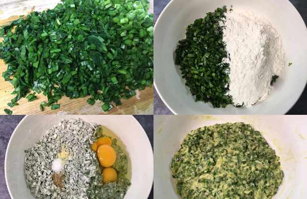 ①韭菜洗凈後切掉老根再切碎,接著裝入大碗中再倒入面粉,抓拌均勻後打入雞蛋,加鹽、雞精和胡椒粉調味,再攪拌成比較黏稠的面糊狀。