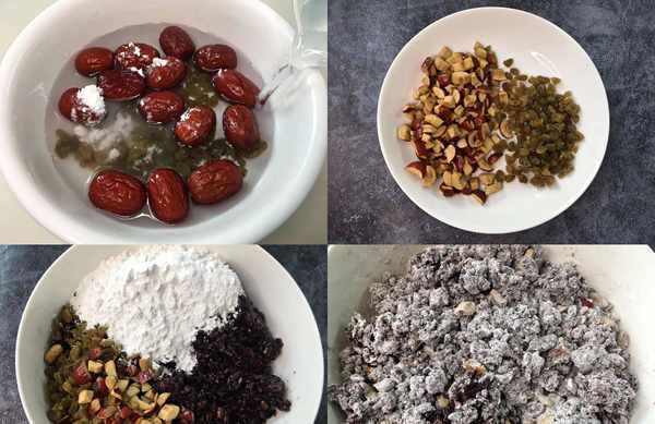 ③紅棗和葡萄幹用淀粉水抓洗,淀粉有很強的吸附性,可以吸附紅棗和葡萄幹表面的灰塵和雜質,抓洗幹凈後再換水清洗幾遍,徹底洗凈後撈出備用。