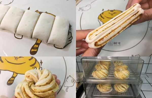 ④再切成相同等份的劑子,先把兩個劑子疊一起拉長,兩頭朝相反的方向擰朝下再捏緊,全部卷好後放入蒸箱中醒發半個小時,半個小時後往蒸箱裡加純凈水,蒸12分鐘燜3分鐘即可。