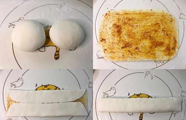 ③往矽膠面墊上撒一些幹面粉防粘,再放上醒發好的面團揉搓排氣,分成2個相同等份的面團,依次將面團搟成長方形的大面片,抹上調好的燒烤料,兩頭先往中間折過來後再對折,像疊被子一樣。