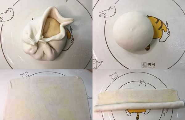 ④把水面團搟成大餅,放入油面團,像包包子一樣包起來,收口朝下再搟成一張長方形的大面片,從一頭卷起。