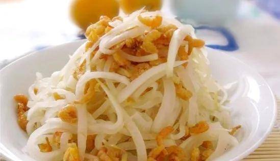 準備食材:白蘿卜、蝦皮、香菜、鹽、生抽、醋、白糖、香油各適量