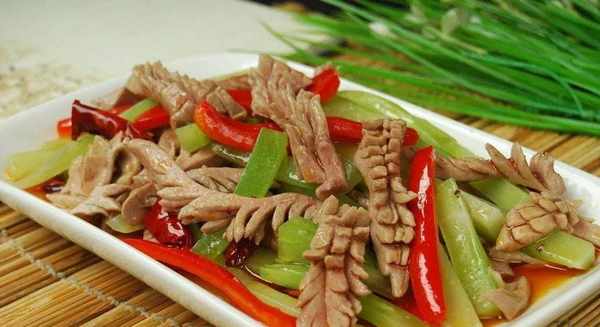 ④鍋中加油,燒至七成熱時,放入腰花快速炒散,放入泡辣椒、薑、蒜、蔥、萵筍條炒出香味,烹入味汁 ,翻炒幾下,起鍋裝盤即可。