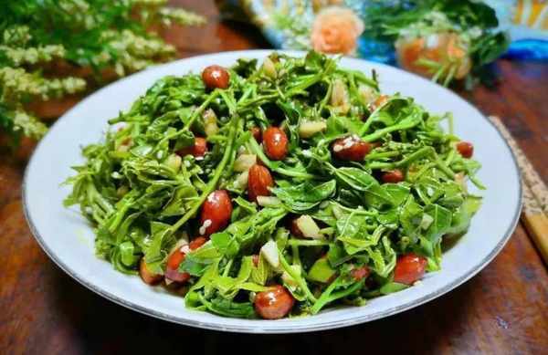 準備食材:花椒芽(嫩葉)、油炸花生米、蒜、鹽、香醋、生抽、雞精、白糖、香油各適量。