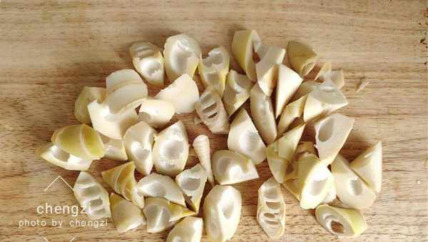2、將春筍剝去外面的老皮,切去根部比較老的部分,清洗幹凈後再切成滾刀塊。