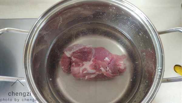 4、今天我傢隻有兩口人吃飯,我用瞭半根豬棒骨,鍋內加水加點料酒,放入豬棒骨焯水2分鐘,再控水撈出。