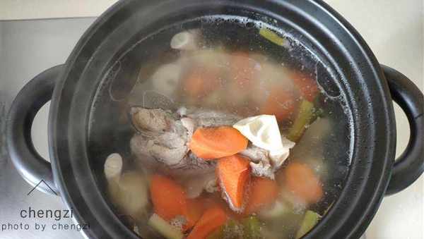 7、砂鍋中加入春筍、胡蘿卜繼續小火燉煮20分鐘左右,煮至食材熟透,加鹽調味就好瞭。