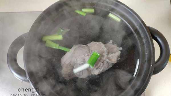 5、焯過水的豬棒骨放入砂鍋中,加入足夠多的熱水,加薑片、蔥段和料酒,大火燒開後轉小火,慢慢熬煮1個小時。