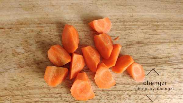 3、胡蘿卜用刮皮刀刮去外皮,也切成滾刀塊。