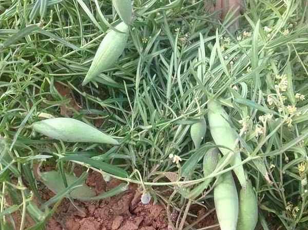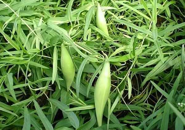 這種羊角瓜,它長得像梭子,植株是多年生草本,喜歡比較幹旱的土地,果實在切開之後可以見到白色的乳液,也不知道以前是聽誰說這種瓜果不好吃,而且吃瞭不好。它的植株長得很小,葉子和竹葉一樣細長,枝條也很細弱,但是它的果實卻很大,掛在枝葉上很打眼。它的學名其實叫做“地稍瓜”,但是因為它的外形長得也像是羊角,所以在農村為瞭方便記憶,人們就取瞭這樣的別稱。