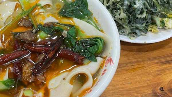 她傢的板面是純手工制作的,師傅在面案上用力地摔打,讓面塊更加有勁道,吃起來有嚼勁,經過恰到時間的煮制後,板面也不會黏在一起,顧客趁熱吃才能品味出它的美味和魅力,板面和摔面感覺相差不多,這是一種手藝,也是一種傳承,當下智能設備替代傳統不在少數,做出來的味道始終少瞭匠人們的味道。