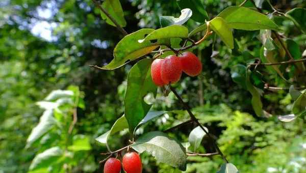 除開茶樹的產物,還有一種美食貫穿著我們的童年,那就是“萢”,我們喊“三月萢”,紅彤彤的果子,記憶中是五月份左右開始成熟。那會剛好是茶泡茶舌的尾期,吃完茶泡茶舌,就迎來瞭香甜的萢。