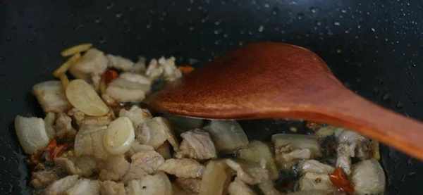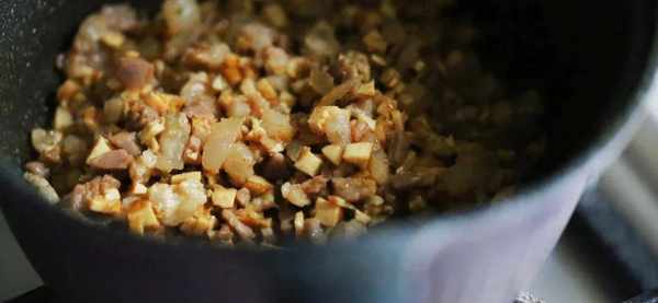 2、油熱下入肉末炒香,一勺料酒十 兩勺生抽+一 勺老抽 十一勺蠔油炒香