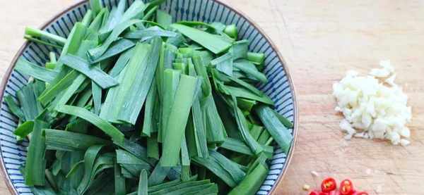 準備食材:韭菜,大蒜,小米椒,生抽,陳醋,白糖,熟油