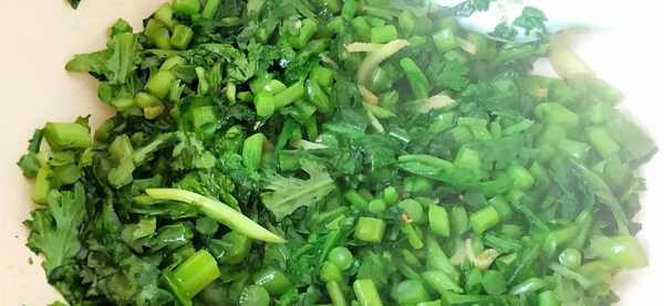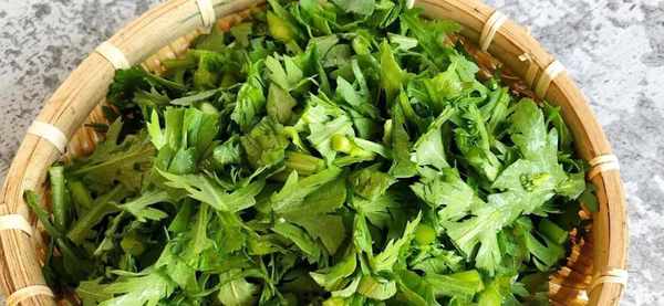 準備食材:茼蒿一把,生薑,食鹽,食用油,蒜末