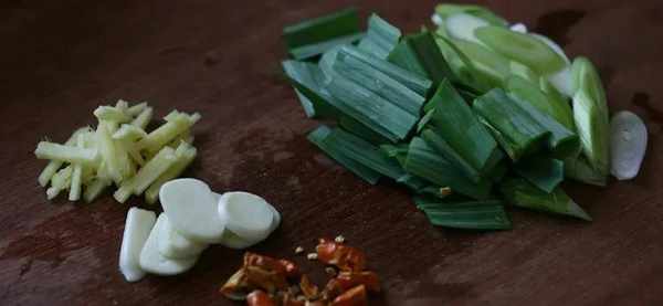 2、將適量薑、蒜、幹辣椒、蒜苗切段備用