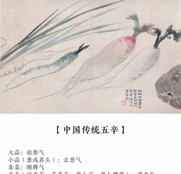 春季,古人有吃“五辛盤”的習俗。明代李時珍在《本草綱目》中說:“五辛菜,乃元日、立春以蔥、蒜、韭、蓼蒿、芥,辛嫰之菜雜和食之,取迎春之意。”