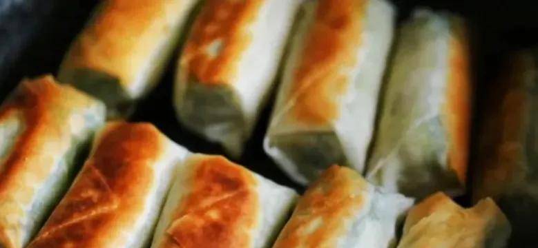 4、春卷皮包入餡料,卷起來,兩頭向中間疊起來