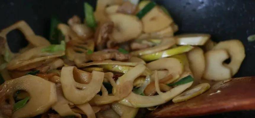4.最後按春筍、鹽、生抽、蒜苗的順序倒入鍋中,繼續翻炒至九成熟就好啦