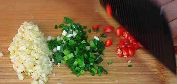 第二步、接著準備多一些大蒜壓扁然後切成蒜末,小蔥切成蔥花,小米椒切成圈,生薑切成薑末。