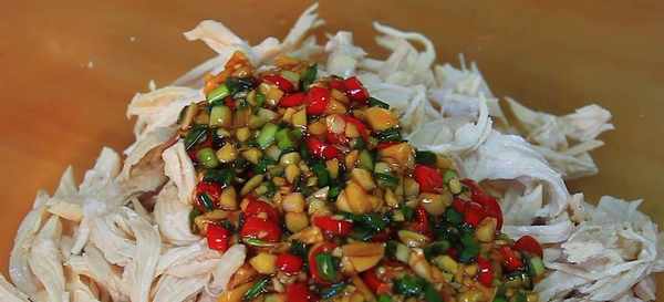 第五步、全部撕好後倒入料汁,戴上手套把調料充分地抓拌均勻,多抓一會兒,讓料汁能夠完全進入到雞肉裡,這樣吃著才入味,然後裝入盤子裡就可以上桌瞭。