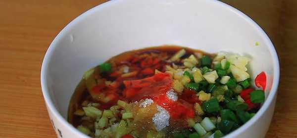 第三步、將切好的配料放入碗中,開始調味,,加一勺生抽醬油,一勺醋,一勺香油,一點味精,一小勺白糖,我還加瞭些辣椒油,然後將調料攪拌均勻。