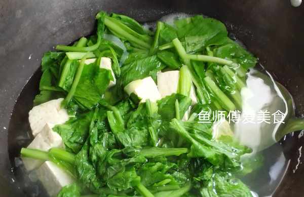 2.燒開後,放入切成段的小白菜,食鹽,燒開後煮2分鐘。