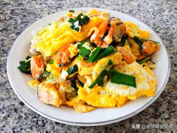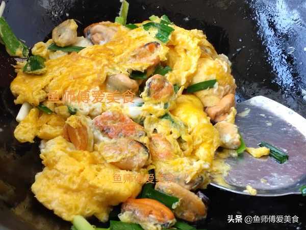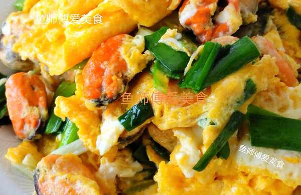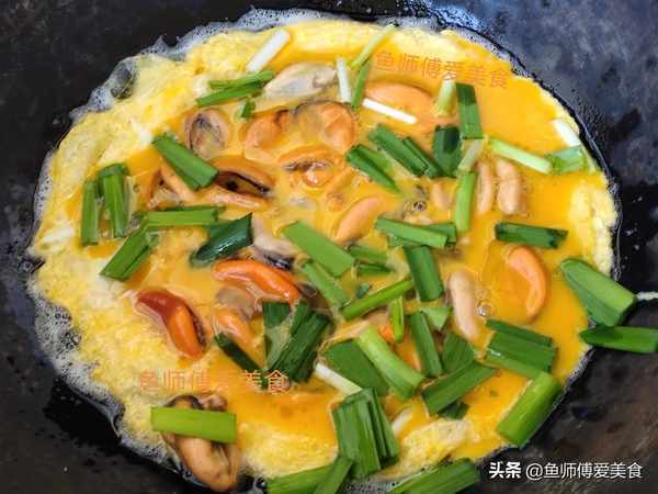 海虹肉是熟的,韭菜也很好熟,所以煎一煎就好瞭,黃燦燦的雞蛋,金紅色的海虹,碧綠的韭菜,色澤美觀,香氣撲鼻,誘人口水。每次我做這道海虹煎雞蛋,孩子都能吃很多。