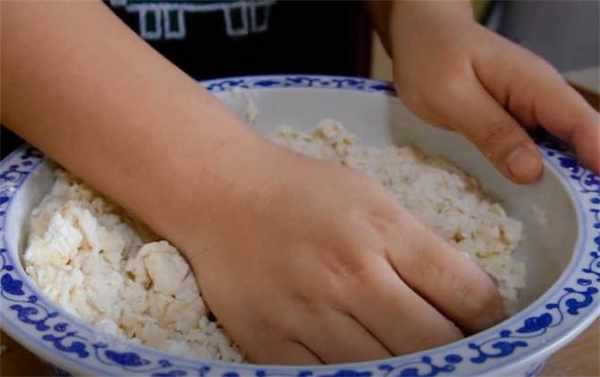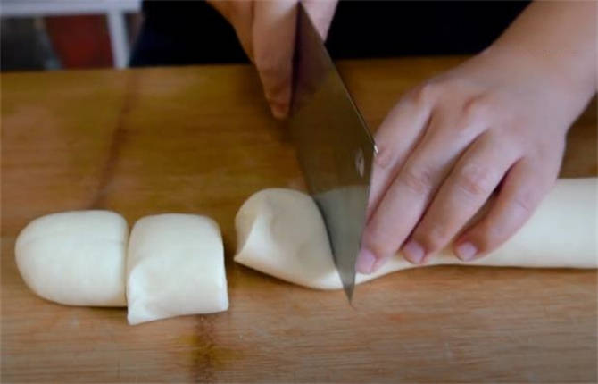 4.油酥做好瞭,開始處理面團,把這個面直接搓成長條,切成小面劑。