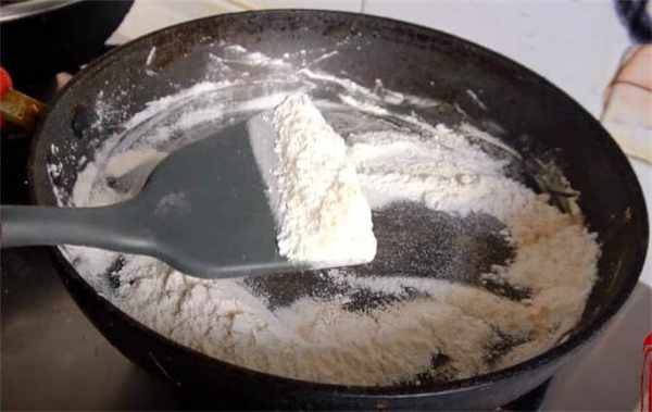2.現在咱們做個油酥,把鍋小火加熱,放上面粉,開始不停的翻炒,把這個面粉炒香瞭,炒到這個面有點微微發黃,聞起來有面香味的時候,就炒好瞭。