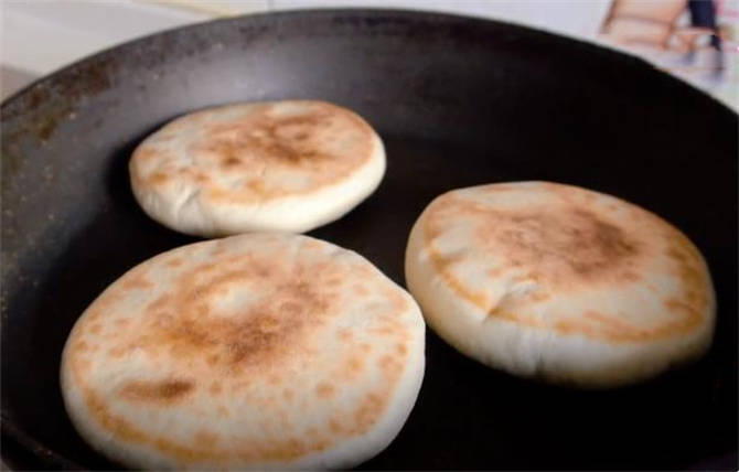 7.咱們先開中火,把這個鍋預熱好,不用刷油,直接放餅胚,蓋上蓋子烙,底面定型瞭翻面,這時候再轉小火,小火再烙2分鐘左右,像這樣餅都鼓起大泡瞭,說明就熟瞭,咱們出鍋。
