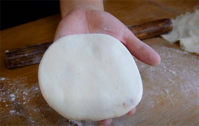 6.把這個收口處給封緊瞭,按扁,搟成圓形的餅皮,咱們做燒餅,搟成這麼大小就差不多瞭。