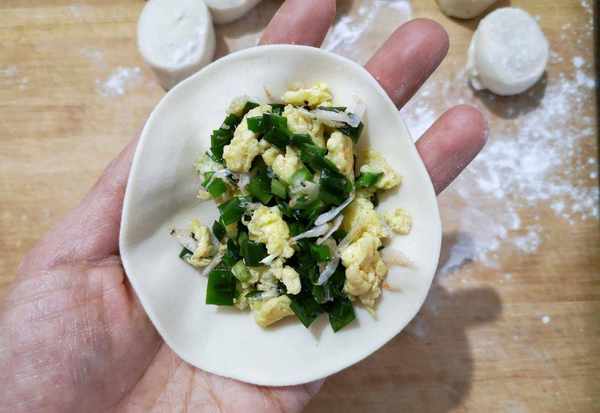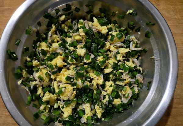 配料:面粉300g,韭菜1把,蝦皮15g,雞蛋2個,鹽4克,十三香3克,麻油5g。