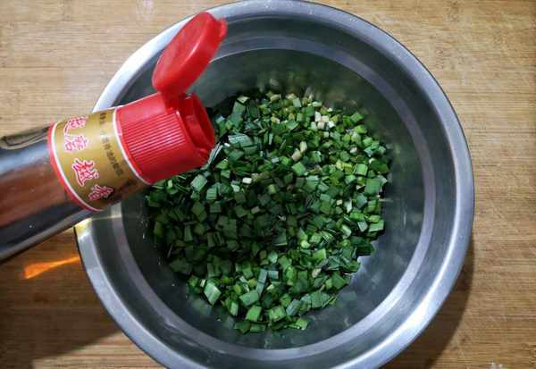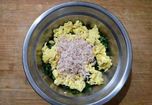 步驟四:切好的韭菜放麻油攪拌均勻,隨後放雞蛋和蝦皮進去攪拌好,要註意韭菜碰到鹽之後會容易出水,所以先不要放鹽,蝦皮含有鹽分也是要先用油攪拌均勻。