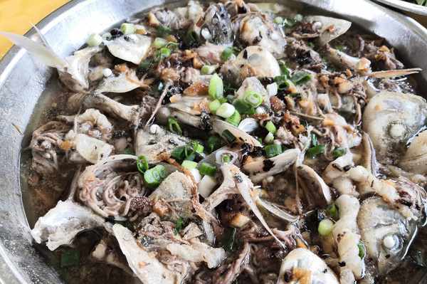 3,豉汁蒸鯪魚頭加魚腸。冬天的鯪魚頭最肥美,現在是當季末尾還可以,鯪魚腸是魚腸中最好吃的。用陽江豆豉醃制,喜歡吃辣的可以加點辣椒醬,我比較喜歡加橙皮絲或者新會陳皮絲,蒸出來的鯪魚頭既鮮美又有果香味。