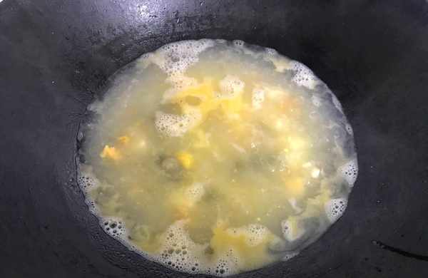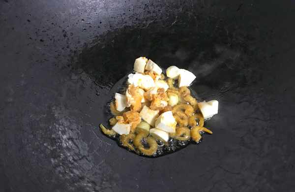 6、一起炒出香味後把咸鴨蛋放入,煸炒至咸蛋黃起沙出油。