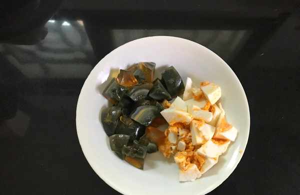 3、皮蛋洗凈後剝去蛋殼,然後切成小塊,咸鴨蛋同樣洗凈後去殼再切成小塊。
