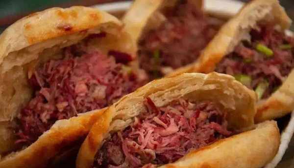 它是用滿滿的驢肉餡用缸爐燒餅包裹起來,做成餡餅,煎至兩面金黃,咬上一口,濃濃的驢肉餡兒香味十足,真的是很過癮!