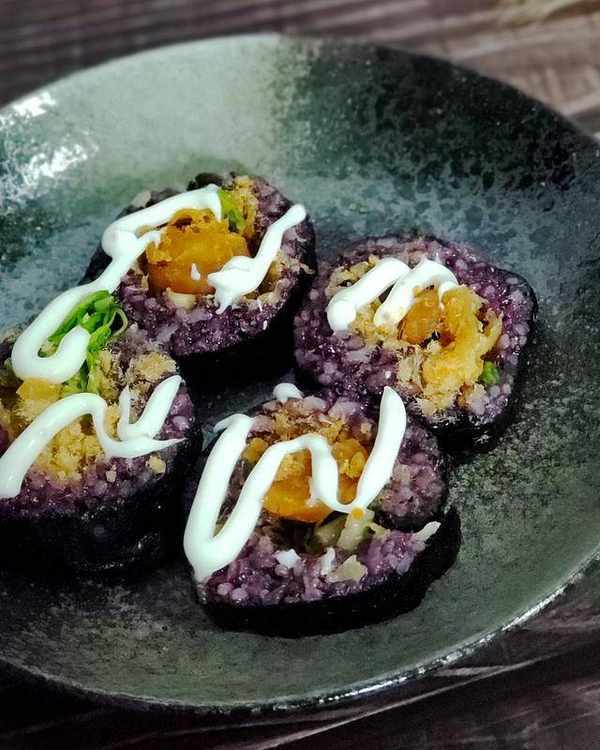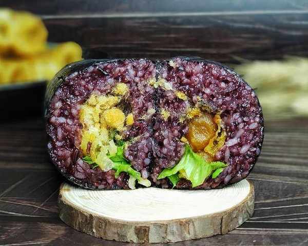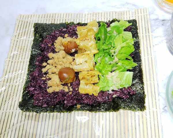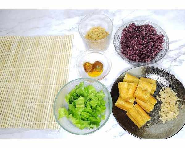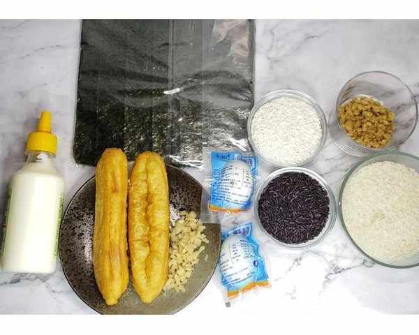 配料:紫米200克,糯米200克。大米400克,油條2根,咸蛋黃2個,肉松適量,生菜適量,紫菜適量,咸菜適量,沙拉醬適量。