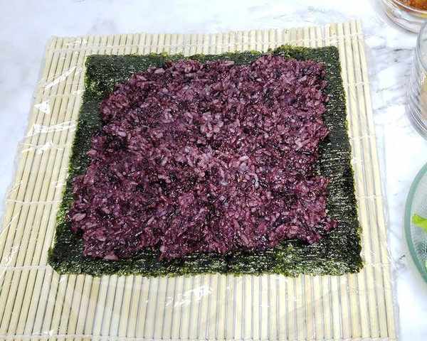 步驟四:把所有蒸熟的米都均勻的鋪在紫菜上,然後要壓實,這一步非常關鍵,否則會讓口感感覺到特別的松散。