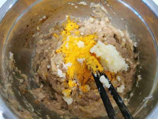 步驟四:攪拌好的雞肉中倒入土豆泥和蛋黃一起攪拌好。