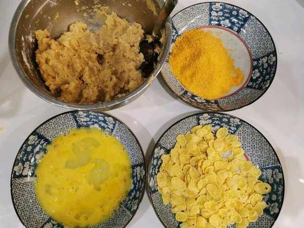 步驟六:把攪拌好的雞肉弄成餅狀,然後裹上蛋液,粘上玉米片和面包糠。