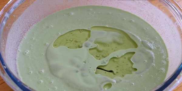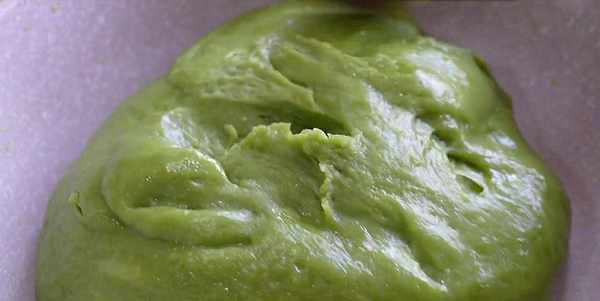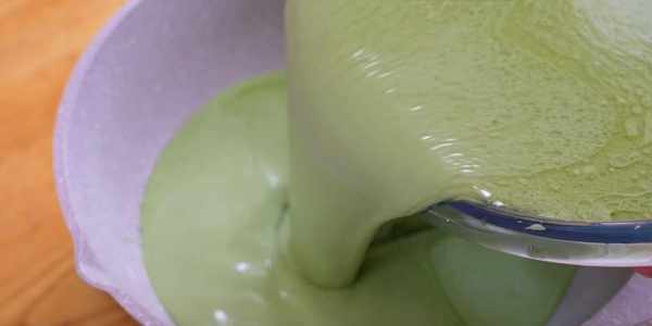 7.取1200毫升的青汁,倒入糯米粉600克,小麥淀粉250克,食用油80克,麥芽糖100克或者蜂蜜100克。把它們攪拌均勻,攪拌到看不見幹面粉為止。