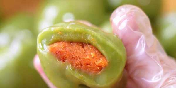 18.揪一小團青團。按扁,放入餡料,把它包起來就 可以瞭。要戴手套,不然會很黏。
