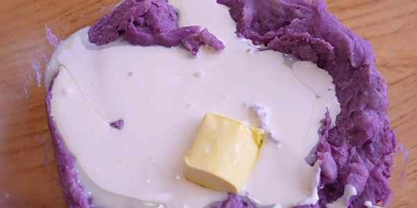14.芋頭紫薯蒸熟,取出來壓成泥。然後加入淡奶油、黃油、煉奶攪拌均勻。