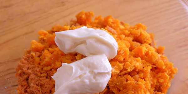16.咸蛋黃烤熟,跟肉松混合,最後加入適量的沙拉醬就可以瞭,抓拌均勻。